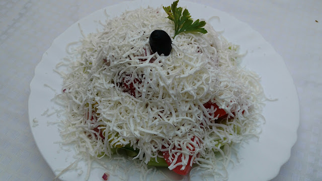 The signature Bulgarian salad is the shopska salad. It usually consists of tomatos, peppers, and cucumbers, and is topped with grated sirene cheese (the Bulgarian version of feta, except creamier).